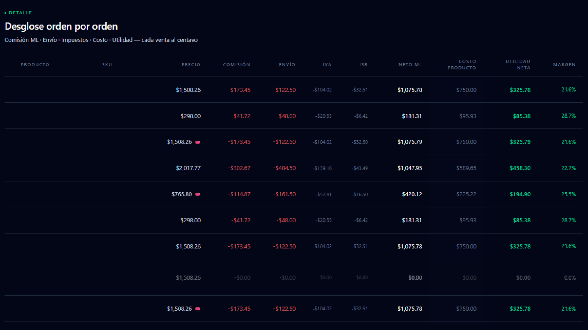 Precio, comisión ML, envío, IVA, ISR y tu costo de producto — desglosado en cada orden. Nada estimado. Nada manual.
