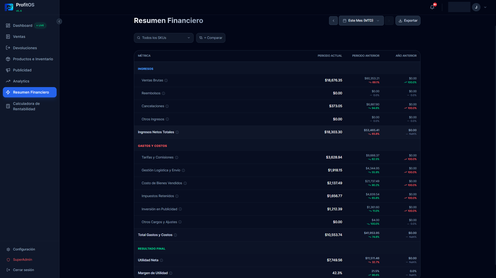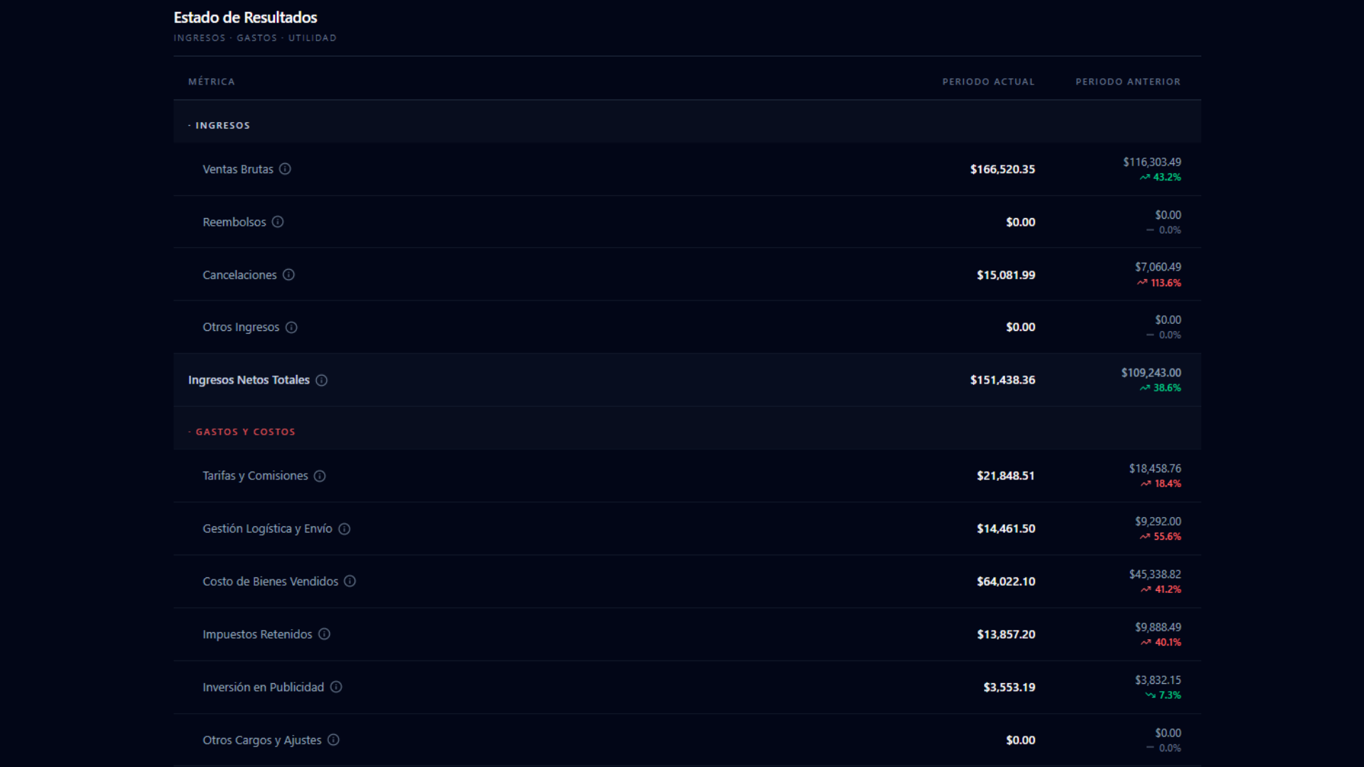Estado de resultados profesional con filtros por SKU, período y canal. Exportable a Excel con hojas de IVA/ISR.