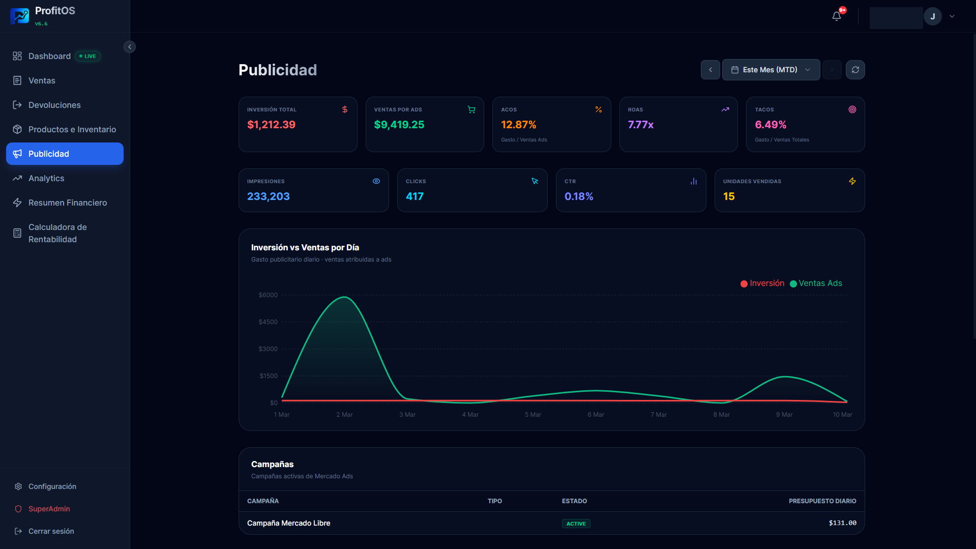 ACoS, ROAS y TACoS con la inversión de Mercado Ads vs ventas atribuidas. Para decidir cuánto seguir invirtiendo.